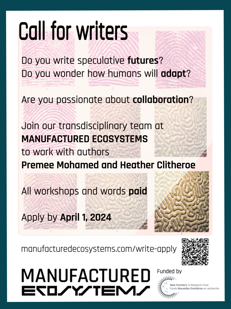 Manufactured Ecosystems is a trans-disciplinary international project that explores the potential for nature-based knowledge, techno-knowledge, and imagined knowledge to forecast the future of climate adaptation. As part of our project, we're developing a future-based science fiction anthology, co-edited by Nebula award-winning author and scientist Premee Mohamed and sci-fi editor and writer, Heather Clitheroe. This project will pair authors with scientists to create biomimicry-inspired stories that will explore and forecast the future of climate adaptation technologies.